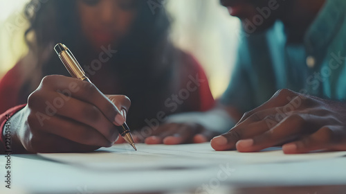 Close-Up of Hands Signing a Document in a Collaborative Setting. Close-up of hands signing a document, symbolizing teamwork, agreement, or legal and business collaboration in a professional environmen