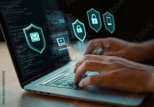 Close-up of Hands Typing on Laptop with Floating Digital Security Icons Representing Cyber Protection