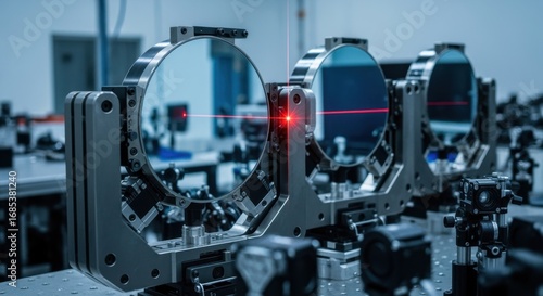 Closeup of highly sophisticated beam steering mirrors within a freeelectronlaser alignment hall critical for directing intense Xray pulses.