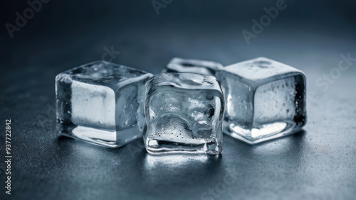 Close-up of ice cubes, transparent and shiny, reflecting light, creating a cold and fresh mood for drinks