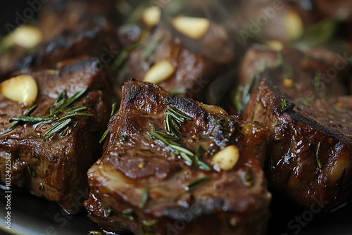 Close-up of juicy steak tips with herb-garlic marinade and charred edges garnished with rosemary and garlic cloves