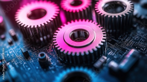 gear, cog, wheel, technology, mechanism, engineering, machine, circuit, board, electronic, hardware, system, network, connection, teamwork, collaboration, industry, innovation, progress, development, efficiency, precision, intricate, complex, detail, metal, metallic, pink, blue, lighting, background, texture, abstract, pattern, design, concept, future, digital, modern, science, manufacturing, industrial, automation, synchronization, integration, process, workflow, productivity