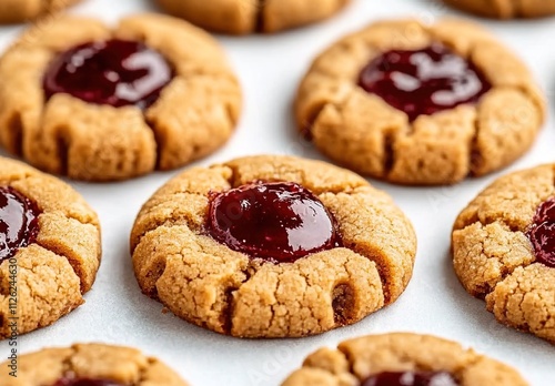 Close-up of multiple jam cookies with the interior visible, laid out on a white surface.