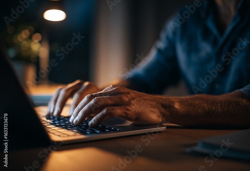 person, typing, laptop, night, work, hand, keyboard, desk, light, sharpened, close, computer, home, study, effort, concentration, late, technology, digital, workstation, online, productivity, man, finger, illuminated, tablet, document, modern, illumination, blur, detail, screen