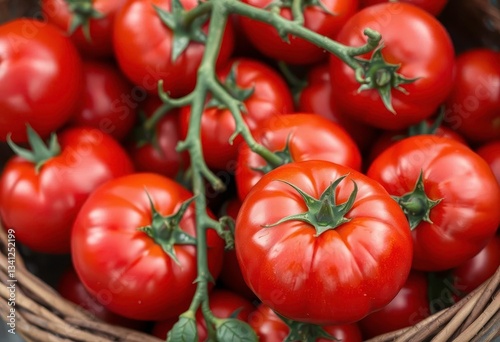 Close-up of plump, red tomatoes overflowing a rustic wooden basket, texture, closeup