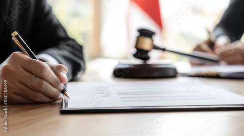 Close-up of politician signing important document on wooden desk, symbolizing political career and decision-making process with flag and cityscape elements.