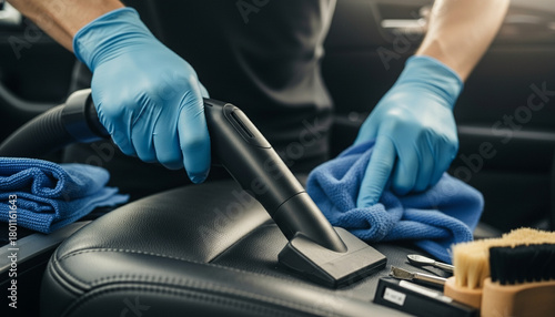 Close-up of professional hands vacuuming leather car seats. Soft natural light highlights leather textures, stitching, and detailing tools. High-resolution, clean, and commercial-ready auto interior