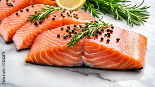 Close-up of raw salmon fillets on a marble table, beautifully garnished with herbs.