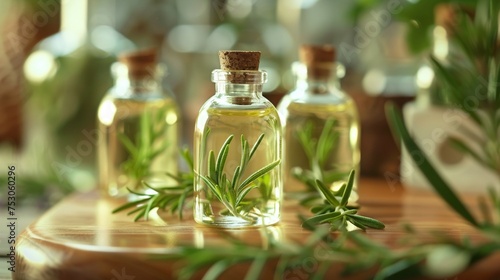 Close-up of rosemary-infused cosmetic essential oil bottles their calming green hues and herbal aroma offering a delightful and refreshing personal care moment