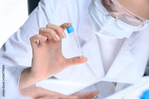 Closeup of scientific research team with clear solution in laboratory. Blonde female chemist holds test tube of glass while her colleague checks results with tablet pc. Blood test, medicine or