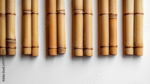 bamboo, chopstick, natural, row, light, brown, asian, food, dining, tableware, wooden, traditional, eastern, organic, minimalist, simple, parallel, straight, cylindrical, vertical, close, up, texture, pattern, material, rustic, ridged, arrangement, surface, white, background, isolated, detail, utensil, pale, smooth, crafted, sustainable, kitchen, eatery