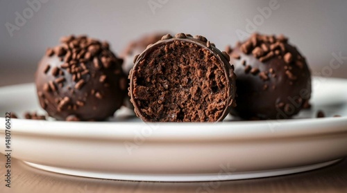 Close-up of several traditional Brazilian brigadeiros arranged on a white plate, soft chocolate texture with chocolate sprinkles, realistic lighting, food photography style.