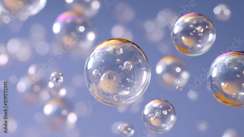 Close-up of shimmering soap bubbles floating in the air, reflecting light and colors, creating a whimsical atmosphere.