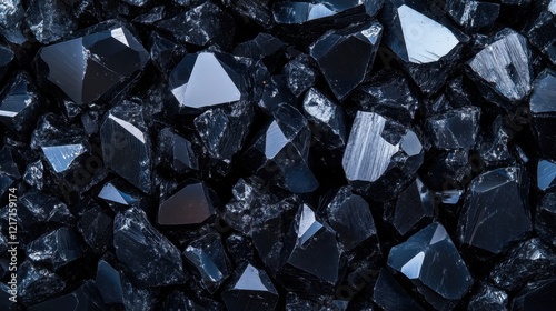 Close-up of shiny black mineral stones with natural light reflections.