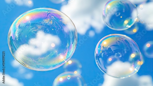 Close-up of soap bubbles being blown outdoors, with bright blue sky and fluffy clouds reflecting on the bubble surface. Gentle breeze visible --chaos
