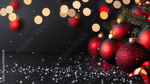 Close-up of sparkling red Christmas ornaments with blurred lights in the background, creating a festive holiday atmosphere