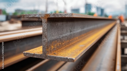 Close-Up of Steel Beams for Construction in Urban Environment with Modern Background