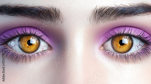 Close-up of striking eyes with vibrant purple makeup and golden irises. design delicate intimacy
