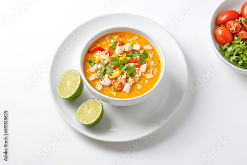thai, food, chicken, soup, rice, noodle, tomatoes, cilantro, lime, wedge, white, plate, background, asian, noodle, delicious, healthy, fresh, meal, lunch, dinner, culinary, cookery, culture, travel, vacation, eatery, cafes, beverage, drink, main, course, dessert, snack, breakfast, brunch, dish, bowl, table, kitchen, cooking, ingredient, receipe, cookbook, chef, dining, eat, styling