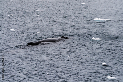 Close-up of the back of a diving humpback whale -Megaptera novaeangliae- including the dorsal fin and blow hole. Image taken inear the entrance of the Lemaire channel, in the Antarctic peninsula.