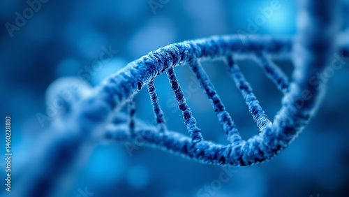 Close-up of the double-helix DNA structure on a blue background, high-resolution photograph.