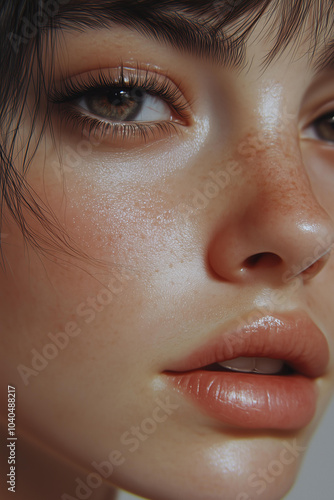 close-up of the face, with clear skin and dark brown eyes, and light freckles on the nose, showcasing natural makeup and soft lighting. The focus is sharp, highlighting every detail from the eyelashes