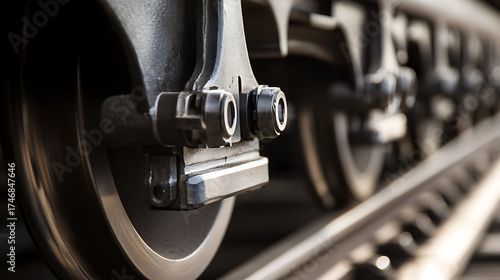 Close-up of train wheels and tracks. The image is focused on the wheels, showcasing the mechanics of rail transport. Durable construction, industrial.