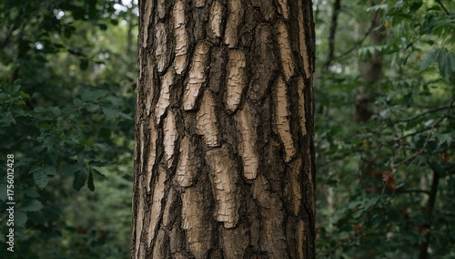 Close-up of tree bark showcasing natural texture and patterns amidst greenery