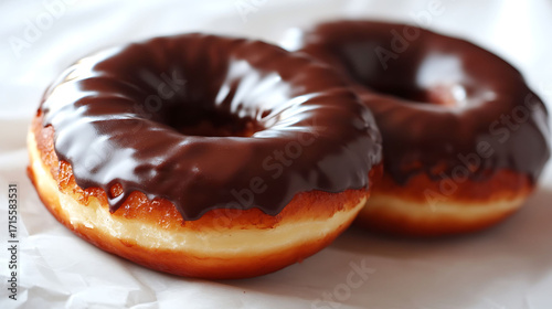 Close-up of two donuts with thick, melted chocolate coating and shiny glaze finish, sitting on crisp white parchment with shadow detail,