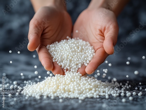 Close-up of two hands holding and presenting a pile of small white round granules, symbolizing purity, abundance, and potential uses in cooking, cleaning, or craft.