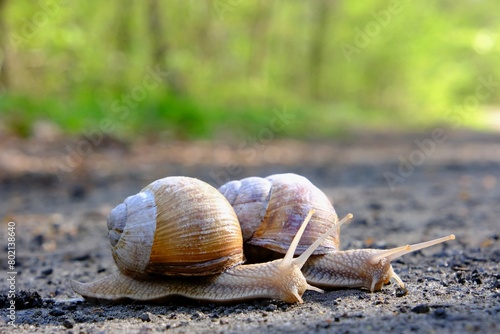 Closeup of two Helix pomatia on the road in forest. Common names the Roman snail, Burgundy snail, edible snail or escargot.
