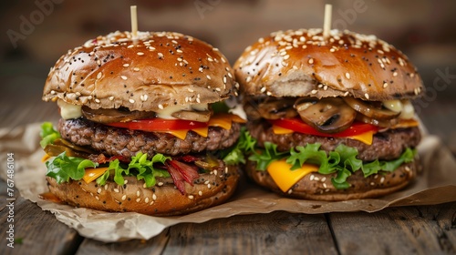 Close-up of two homemade juicy burgers with mushrooms on a wooden cutting board