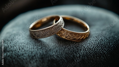 ring, wedding, gold, silver, jewellery, couple, love, marriage, promise, commitment, eternity, romance, affection, human relationships, togetherness, union, celebration, ceremony, symbol, adornment, accessory, fashion, style, design, pattern, intricate, detail, elegance, luxury, precious, metal, band, circle, round, smooth, texture, dark, background, closeup, macro, photo, image, picture, object