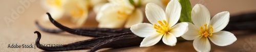 Close-up of vanilla bean pod nestled amongst delicate blossoms , purple, white, aromatherapy