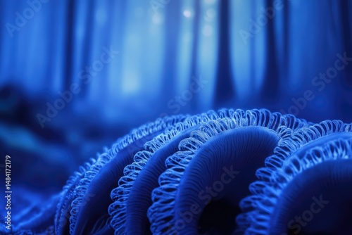 forest, mystical, fantasy, nature, macro, closeup, gill, fungal, fairy tale, enchanted, magical, surreal, dark, moody, mysterious, deep blue, vibrant, intricate, detail, texture, background, wallpaper, artwork, digital artwork, photo, biology, mycology, science, art, abstract, dreamlike, aethereal, twilight, night