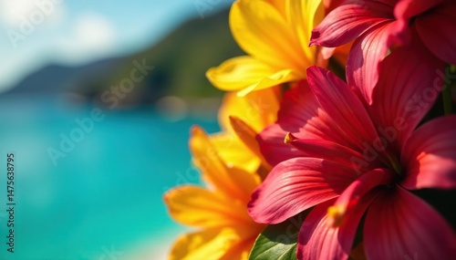 Close-up of vibrant lei, traditional Hawaiian flower garland Bright colors, intricate details , plumeria, summer, garland