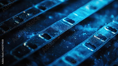 Close-up of vintage film negatives illuminated in deep blue light, highlighting their details and textures.