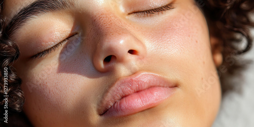 face, skin, freckle, eye, closed, nose, lip, texture, woman, closeup, sunlight, lighting, beauty, natural, make-up, freckled, facial, feature, detail, portrait, hair, curly, soft, peachy, complexion, youthful