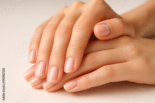 Close-up of woman's hands with natural-looking manicured nails, demonstrating skincare and hand care, with soft light and clean, healthy appearance on neutral background.