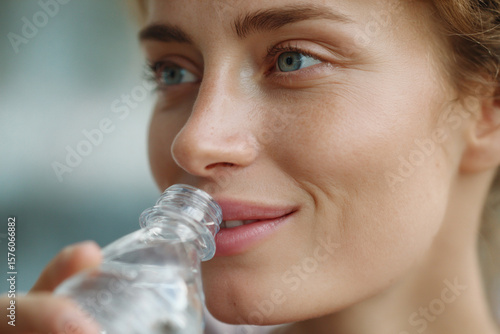 Close-up of woman’s lips touching bottle as she drinks mineral water, soft natural light, refreshing expression.