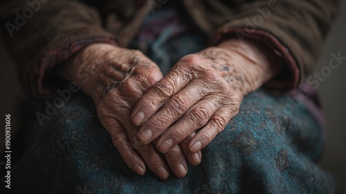 hand, elderly, ageing, wrinkle, skin, old, senior, wisdom, longevity, retirement, life, life events, texture, closeup, macro, resting, clasped, grace, compassion, vulnerability, strength, detail, human, maturity, ancestor, grandmother, grandfather, care, kindness, peace, patience, history, bequest, heritage, authentic, natural, cinematic, mood, peaceful, quiet, stillness, sitting, lap, clothing, fabric, blue, brown, earth-tone