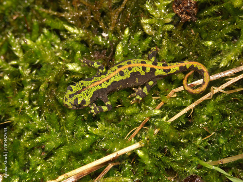 Closeup on a juvenile French marbled newt, Triturus marmoratus sitting on green moss
