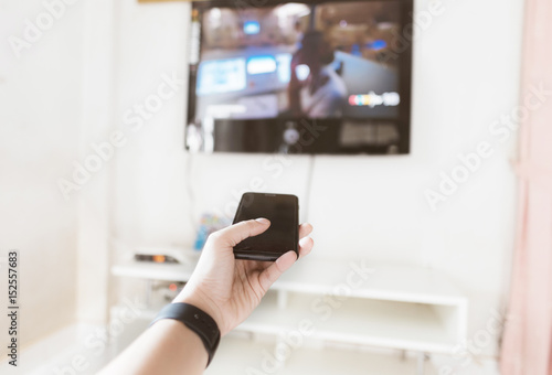 Closeup on hand holding smartphone and use a app with remote control and surfing programs on television in selective focus.