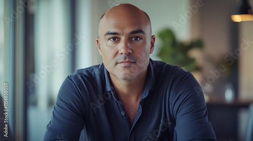 Close-up Photo: Confident Man Calmly Gazing, Modern Office Setting. AI Generated