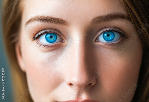 close-up photo of a beautiful woman with blue eyes. generative ai