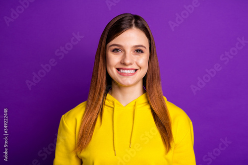Closeup photo of attractive pretty lady white toothy smile good mood street look wear casual yellow hoodie sweatshirt isolated vivid violet color background