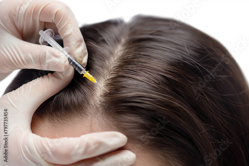 Close-up photograph of a woman being given hair injections into her scalp by a trichologist, prevention of hair loss, trichology, alopecia, beauty, health.