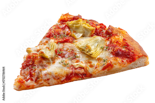 pizza, slice, artichoke, heart, topping, cheese, tomatoes, sauce, crust, food, delicious, tasty, italian, hot, ready, eat, meal, dinner, lunch, savoury, mouth-watering, appetising, fresh, baked, isolated, background, crispy, gold, brown, red, white, ingredient, alimentary, healthy, diet, carb, flavorful, homemade, eatery, fast food, american