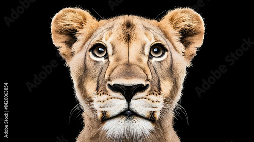 lion, lioness, animal, wildlife, mammal, portrait, face, eye, head, nature, closeup, detail, texture, brown, black, tan, orange, gold, dark, spot, pattern, fauna, wild animal, african wildlife, savanna, head shot, animal portrait, big cat, predator, focused, still life, isolated, black background, wildcat, powerful, felino
