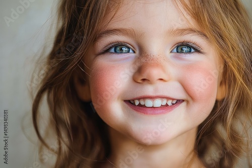 close-up portrait of a smiling young girl with blue eyes, light freckles, rosy cheeks, and long light brown hair showing happiness and innocence